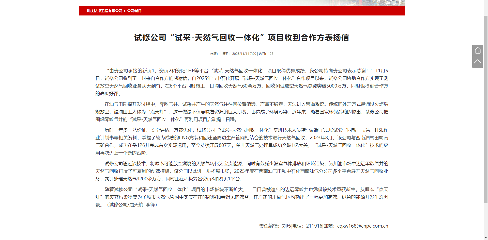 “由贵公司承接的新页1、资页2和资阳1HF等平台‘试采-天然气回收一体化’项目取得优异成绩,我公司特向贵公司表示感谢!”11月5日,试修公司收到了一封来自合作方的感谢信。自2025年与中石化开展“试采-天然气回收一体化”合作项目以来,试修公司协助合作方实现了测试放空天然气回收业务从无到有,在6个平台同时施工,日均回收天然气60余万方。回收测试放空天然气总数突破5000万方,同时也得到合作方的高度好评。