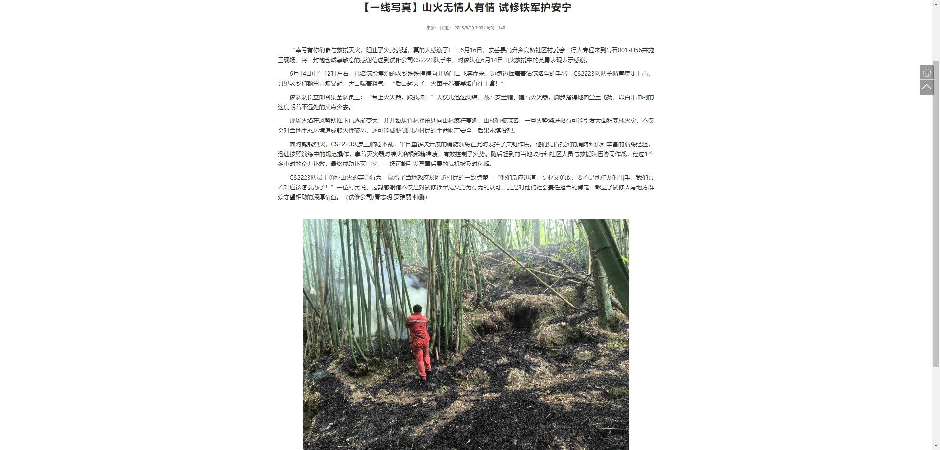 该报道重点拍摄展现CS2223队员工勇扑山火的英勇行为。刊出后引发社会广泛讨论,村民的感谢不仅是对试修铁军见义勇为行为的认可,更是对他们社会责任担当的肯定,彰显了试修人与地方群众守望相助的深厚情谊。 “幸亏有你们参与救援灭火,阻止了火势蔓延,真的太感谢了!”6月16日,安岳县高升乡高桥社区村委会一行人专程来到高石001-H56井施工现场,将一封饱含诚挚敬意的感谢信送到试修公司CS2223队手中,对该队在6月14日山火救援中的英勇表现表示感谢。