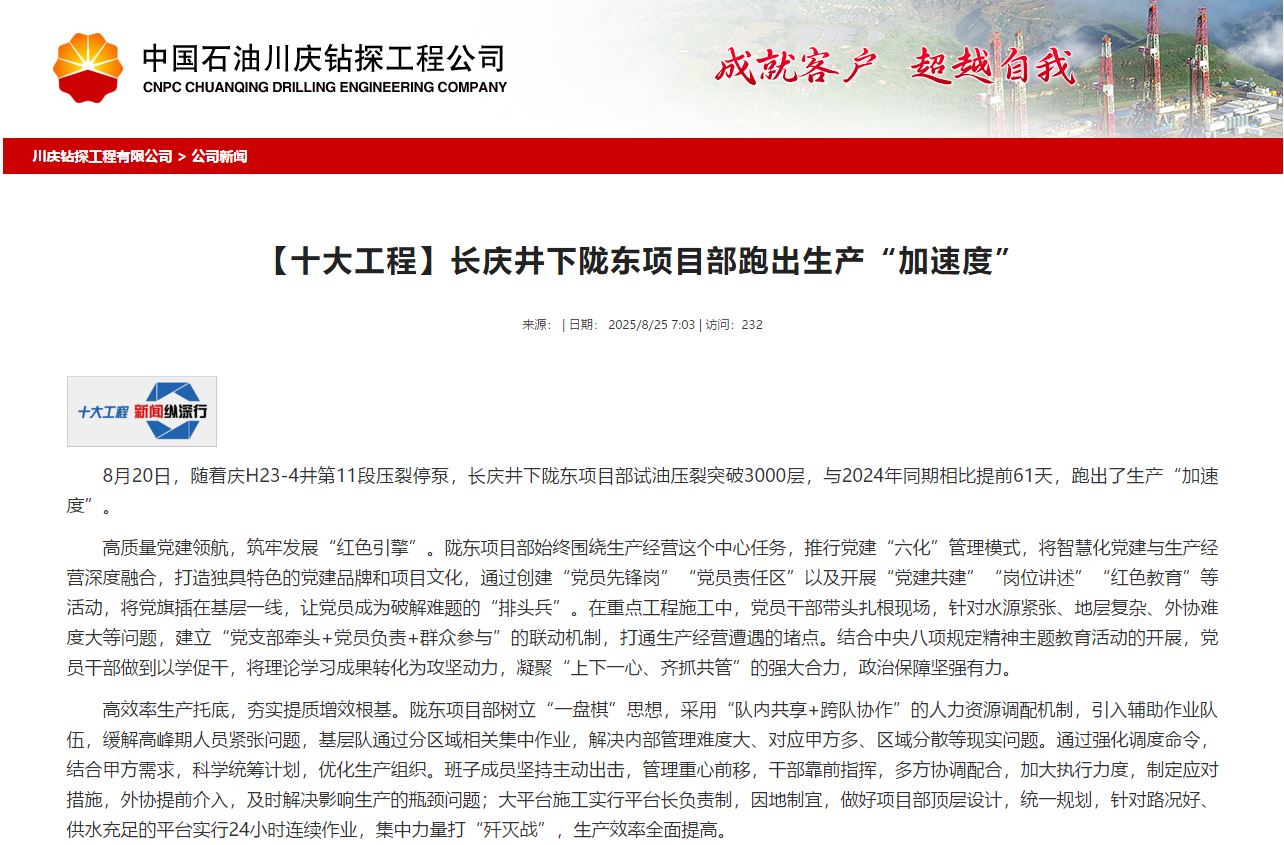 8月20日,随着庆H23-4井第11段压裂停泵,长庆井下陇东项目部试油压裂突破3000层,与2024年同期相比提前61天,跑出了生产“加速度”。