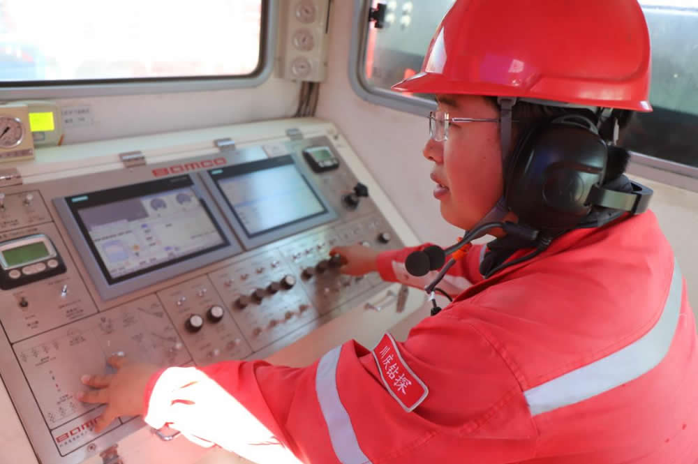 图八:混砂车操作工蒋东瑞正专注地操作着控制面板,面板上屏幕闪烁、按钮密布,全神贯注于各项参数。