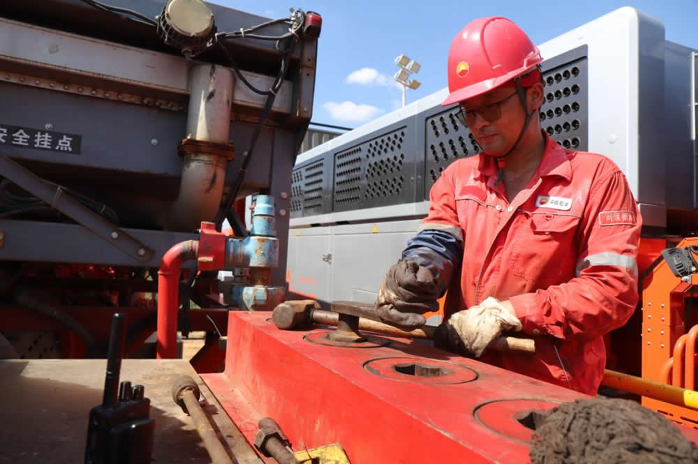 图九:施工间隙,压裂车操作工刘小平进行拔泵,维护保养压裂设备。