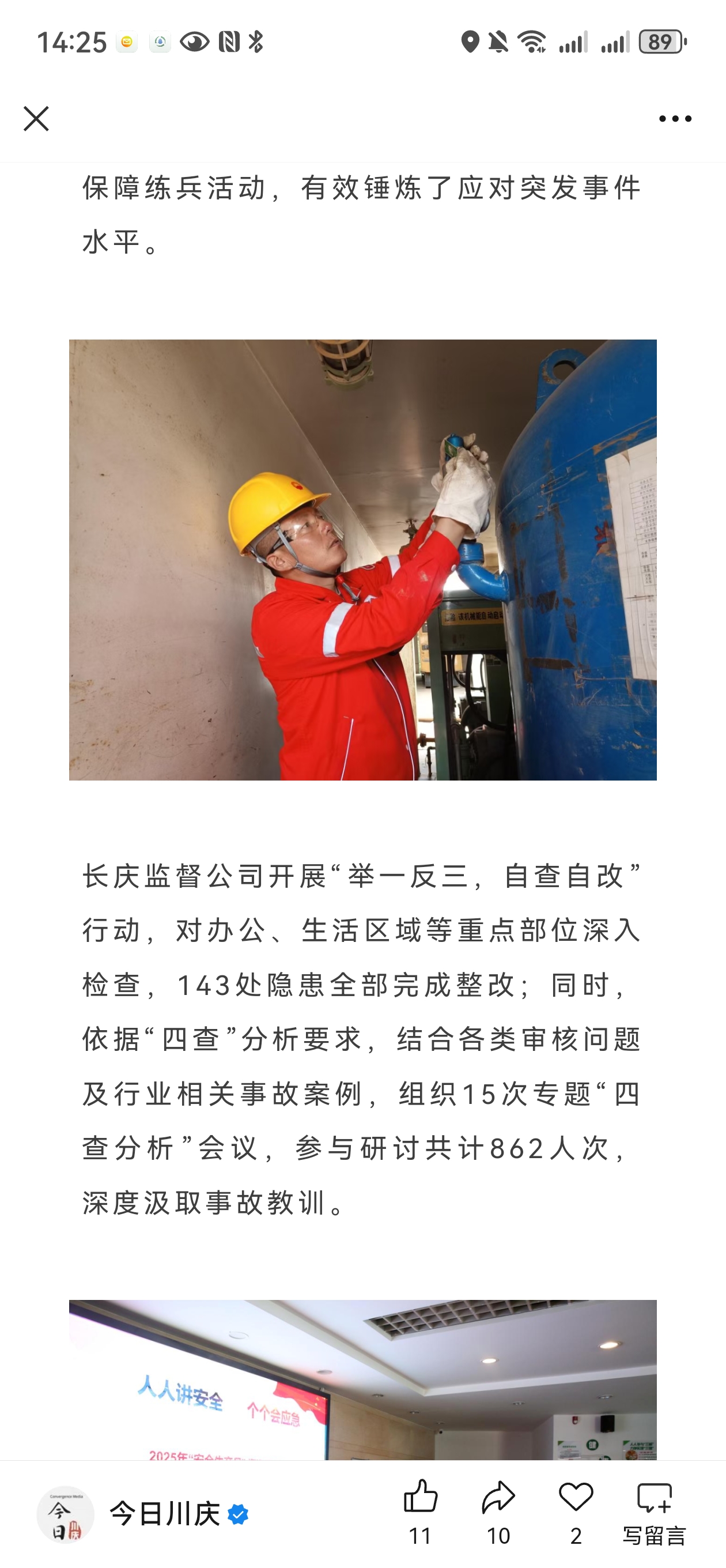 长庆监督公司开展“举一反三,自查自改”行动,对办公、生活区域等重点部位深入检查,143处隐患全部完成整改;同时,依据“四查”分析要求,结合各类审核问题及行业相关事故案例,组织15次专题“四查分析”会议,参与研讨共计862人次,深度汲取事故教训。