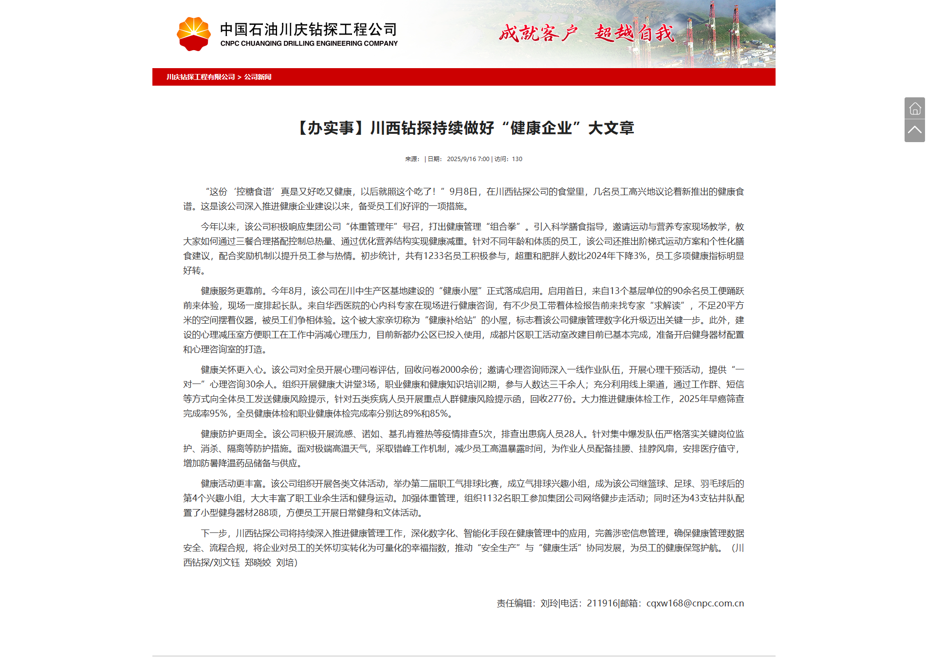 “这份‘控糖食谱’真是又好吃又健康,以后就照这个吃了!”9月8日,在川西钻探公司的食堂里,几名员工高兴地议论着新推出的健康食谱。这是该公司深入推进健康企业建设以来,备受员工们好评的一项措施。