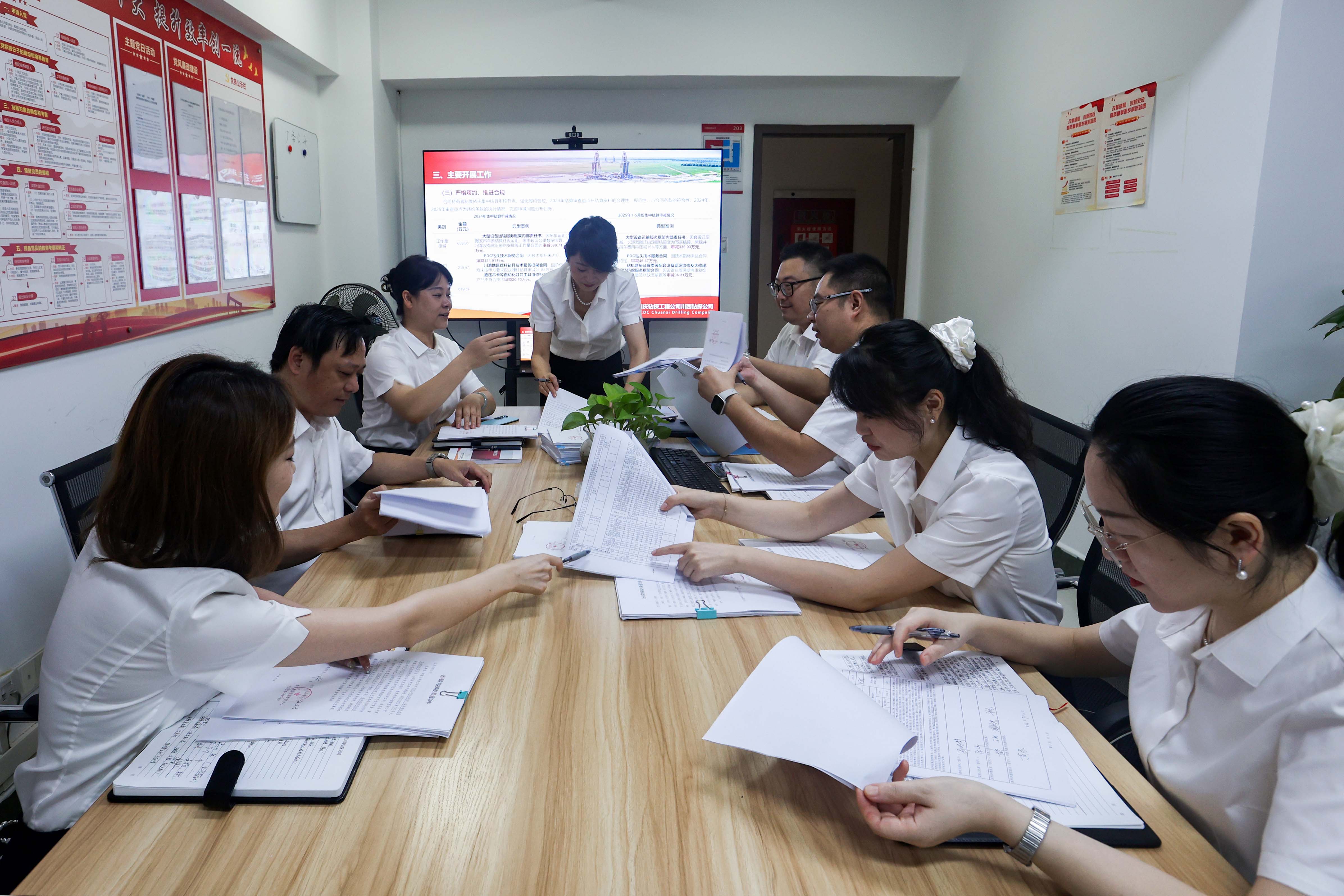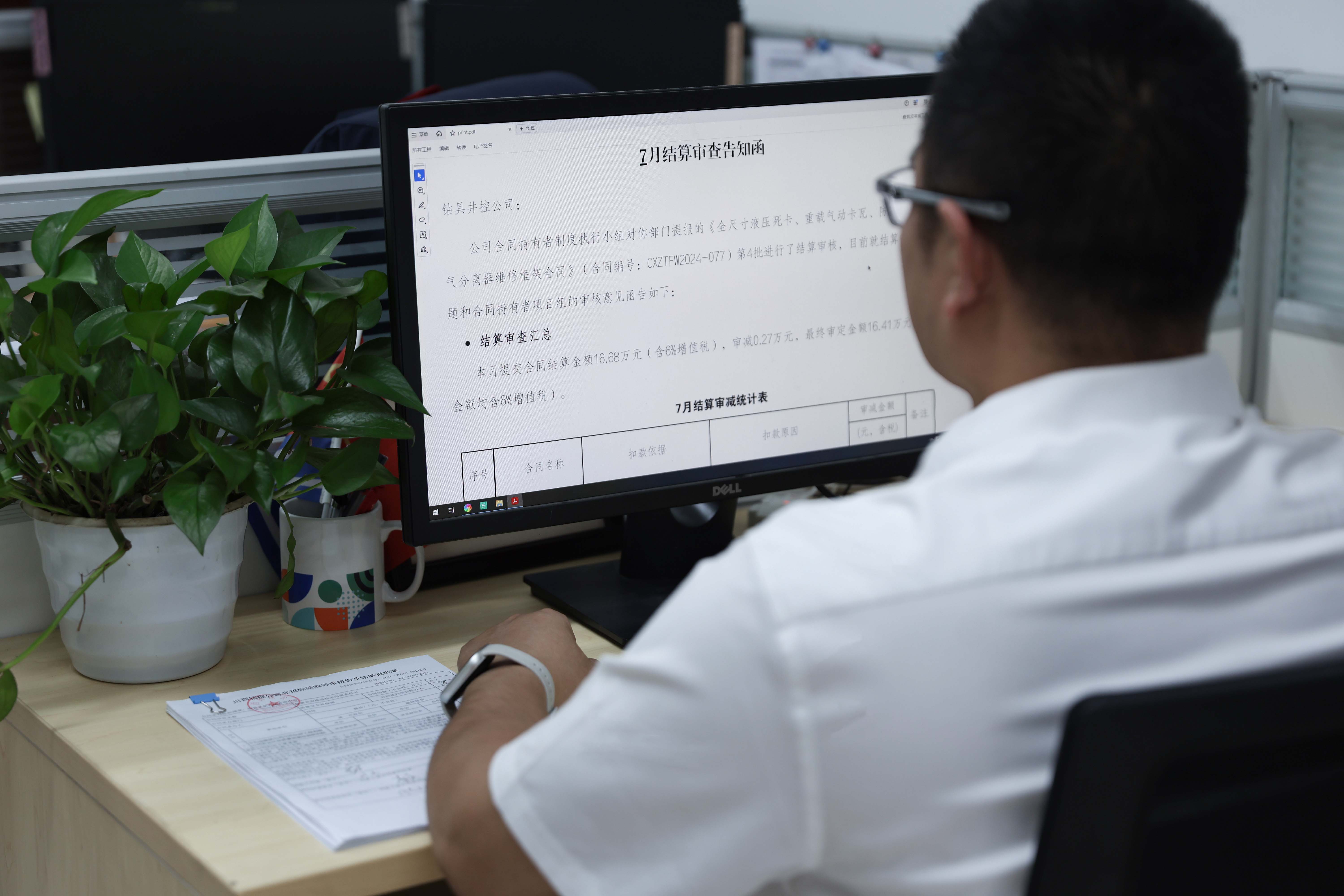 合同持有者制度实施“责任金字塔”架构——由公司领导、部室负责人、合同承办人、业务经办人,分别担任I、II、III、IV级合同持有者,形成一种逐级向上、层层压实的双轨管理模式。图为III级合同持有者易娜和同事一起审查当月单据。