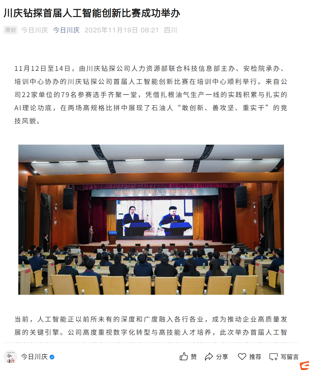 这则新闻聚焦川庆钻探首届 AI 创新赛,紧扣数字化转型趋势,凸显赛事专业性与务实导向,既展现企业创新决心,也传递行业智能化发展活力,报道精炼且重点突出。 11月12日至14日,由川庆钻探公司人力资源部联合科技信息部主办、安检院承办、培训中心协办的川庆钻探公司首届人工智能创新比赛在培训中心顺利举行。来自公司22家单位的79名参赛选手齐聚一堂,凭借扎根油气生产一线的实践积累与扎实的AI理论功底,在两场高规格比拼中展现了石油人“敢创新、善攻坚、重实干”的竞技风貌。